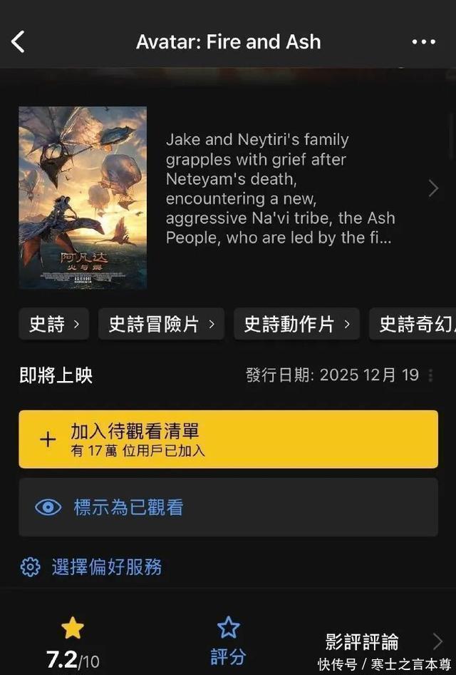 在第三部中,电影将聚焦潘多拉星球上神秘未知的第三个纳美人部族——灰烬族。据卡梅隆透露,与此前善良美好的纳美人不同,灰烬族的族人们充满了愤怒和狂躁,将颠覆“人类等于恶,纳美人等于善”的设定。 该片近日在洛杉矶首映后,口碑也同步解禁,著名影评网站imdb给出了7.2分(近600人打分),有网友表示又是一场视觉盛宴,规模大到难以想象,也有网友表示剧情似曾相识,显得重复和冗长。